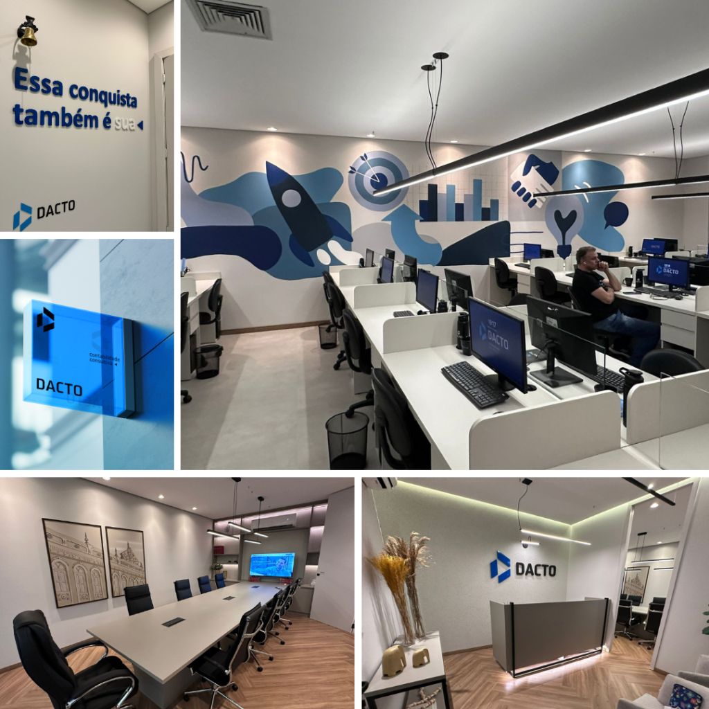 Em 2024, demos mais um passo importante: o rebranding da marca, que oficializou a transição de RV para Dacto Contabilidade Consultiva, um nome que traduz melhor quem somos e como atuamos. Dacto é sinônimo de solidez, estratégia e acompanhamento contínuo. E não à toa, o novo nome veio acompanhado de um novo espaço, pensado para fortalecer ainda mais nossa cultura e modelo de atendimento.